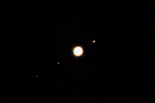 望遠鏡を使えば、肉眼とは違った楽しみ方ができる。 小口径の望遠鏡でも、木星表面の縞模様やガリレオ衛星の動きが観測できる。 望遠鏡の視野の中の木星は小さく、ボイジャー探査機やハッブル宇宙望遠鏡 が撮影した写真に比べると見劣りするが、大気の影響でゆらゆらとゆらめく 姿は、まさに今自分の目で宇宙の神秘に触れているという感動を与えてくれる。 30分ほども見ていれば、4つのガリレオ衛星が木星の周りを回っていることが分かるだろう。 ガリレオ衛星たちは、稀に互いに姿を隠しあう「相互食」という現象を起こすことがある。 衛星の1つがわずか数分から数十分の間に急に暗くなり、またすぐに元通りの明るさに戻るという、スリリングなイベントだ。 詳しくは、 ガリレオ衛星の相互食を見よう!を参照。