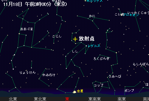 今年のピークは、予想では11月18日午前中とみられ、ヨーロッパ方面が条件がよいとされています。しかし、昨年のように、予想が外れる可能性もありますから、今年も要注目です。いつ、突発的な出現があるか分かりませんので、注意しながら観測したいものです。