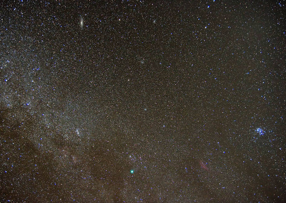 (1枚目)ただでさえにぎやかなこの空域に、新たな仲間が増えました。しばらく楽しめそうです。空の暗い当地では、肉眼で恒星とは区別できます。ようやく彗星のような色になってきました。眼視ではαPerよりやや暗く、2.4等前後とこの数日変わりません。