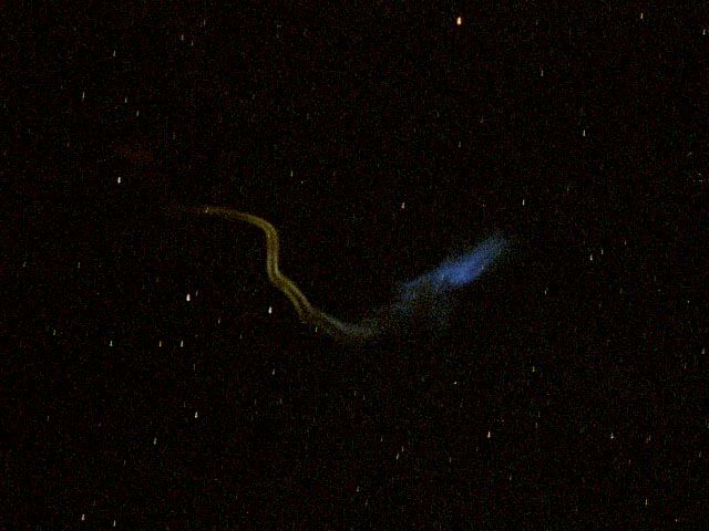 撮影機材等/Nikon FM2 180mm ED F2.8、Fuji 1600、バックはニュートラルな色調になるように色補正●撮影者コメント:19 日 3 時 26 分にプレセペとこじしの間に流れた流星痕の連続写真です(星図はこちら)。ブルーに写った上層大気部分の痕が下層になるに従いオレンジに変化する様がとても印象的でした。こんな色に写った痕は初めてです。