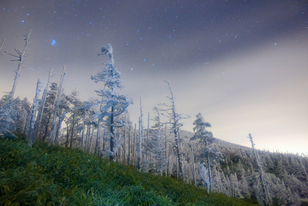 (5枚目)今回狙っていた構図です。緑の草原に白い霧氷林、青い星、雪が一度積もれば観られなくなる景観。やはりプレアデス星団がポイントになります。