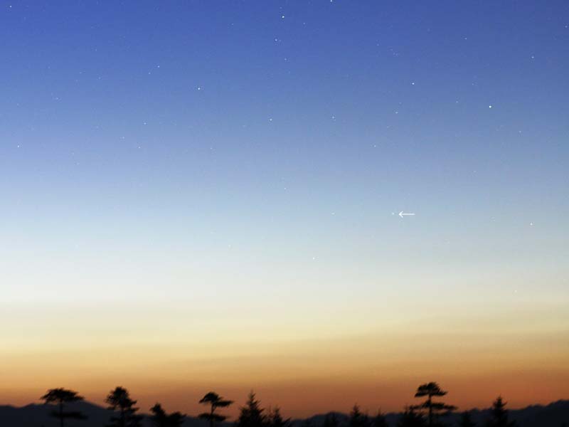 思い立ったら吉日で出かけたのはいいのですが、事前にちゃんとステラナビなどで確認して行かなかったため、リニア彗星と他の星を誤認してしまい、かろうじて右はじに写っていた部分をトリミングしました。