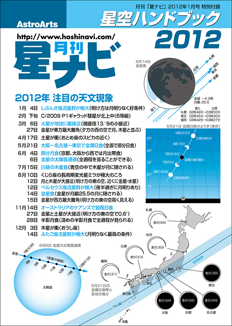 2012年はズバリ、天文現象の当たり年だ。定番の流星群や月と惑星たちの接近はもちろん、金環日食や金星の太陽面通過、木星食に金星食と見逃せない現象が目白押しである。そんな2012年の見どころをまとめて解説しよう。