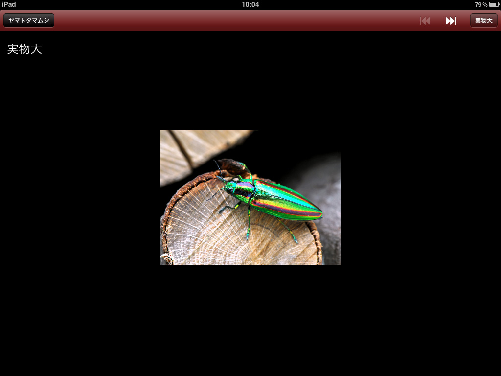 - 図鑑カードの昆虫写真をタップすると、写真表示画面になります。