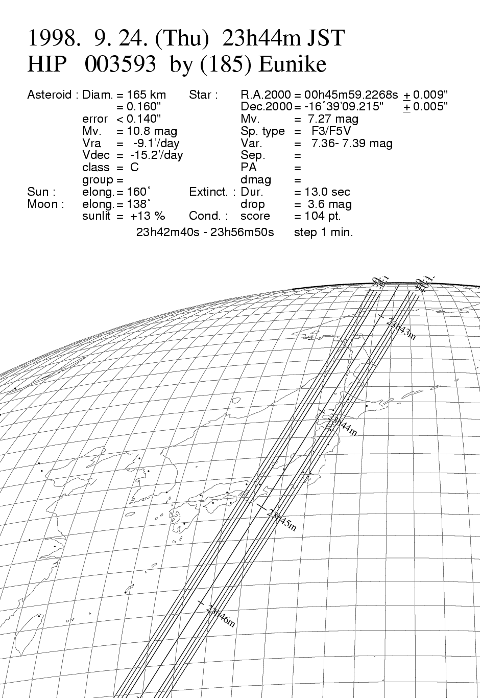 24日(木)に起こると予報されている小惑星(185)Eunike(10.8等)によるHIP003593(7.27等)の掩蔽の改良予報の精度は、十分高く、小惑星の大きさのわずか1/4です。 このため、この現象を接食のような感覚で遠征観測する計画が、関東や近畿の観測者の間で持ち上がっています。 高速道を利用し、新潟、長野、岐阜あたりのインターチェンジを降りた所やパーキングエリアで観測しようというものです。 布陣の間隔は、5〜20km程度で十分なので、携帯電話が連絡に便利と思われます。