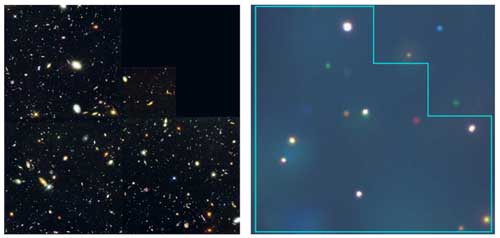 左はハッブル宇宙望遠鏡による「ハッブル・北ディープフィールド」。右は「チャンドラ・北ディープフィールド」の一部で、「ハッブル・北ディープフィールド」に対応する部分。