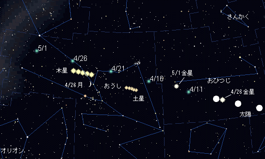 4月11日から5月1日までの45P/本田・ムルコス・パイドゥーシャーコバー彗星(青緑色の点)の動き(ステラナビゲータ5の星図を元に作成)
