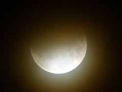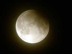 本影食開始10分前のようす。 半影食はすでに始まっていて、月の左肩がだいぶ暗くなっているようすが、肉眼でも確認できた。 |