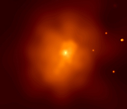 今年の9月5日から7日にかけて、シンポジウム「チャンドラによる科学の二年間(Two Years of Science with Chandra)」がワシントンD.C.で開催されました。マサチューセッツ工科大学のアラバジス(Arabadjis,J.)たちは、チャンドラを使って、2000年9月3日から4日にかけ、EMSS1358+6245と呼ばれる銀河団を15.3時間観測し、その暗黒物質の分布を調査した結果を発表しました。銀河団に含まれる暗黒物質の量はX線を放射する高温ガスの圧力からわかり、それにハッブル宇宙望遠鏡による観測の光学データを組み合わせて、暗黒物質の分布が推定できるということです。銀河団 EMSS1358+6245に含まれる暗黒物質の量は目に見える物質の約4倍で、銀河団中心から約15万光年の範囲に、ほぼ一様に分布しているとアラバジスたちは述べています。その他の発表を含めて、今回のシンポジウムで、暗黒物質についての謎が解け始めたような気がします。