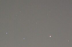 ●撮影者コメント:火星は 6 月の再接近からはずいぶん遠ざかってしまったが、今もやぎ座にあり、赤く輝いている。そしてやぎ座 γ の北にいる天王星に近づきつつある。写真中央の星が天王星、右下方の明るい星が火星である。月が写野すぐ左にあり、写真にするのは難しいところ。この先の天気予報はあまり思わしくないが、もし続けて撮れたら、私の HP 中、惑星のスナップに掲載の予定。