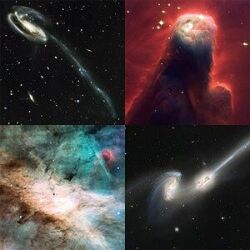 ACSカメラで撮影された4つの写真。(左上)「おたまじゃくし銀河」UGC 10214、(右上)「コーン星雲」NGC 2264、(左下)「オメガ星雲(白鳥星雲)」M 17の中心部、(右下)衝突している「ねずみ銀河」NGC 4676。(提供:NASA, H. Ford (JHU), G. Illingworth (USCS/LO), M. Clampin (STScI), G. Hartig (STScI), the ACS Science Team, and ESA)