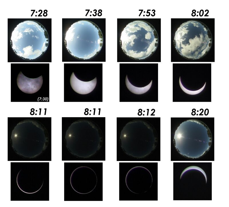 - 今回、ビデオカメラを使用して全天周ビデオ撮影と拡大撮影を行いました。それぞれの時刻の空の状態と、太陽の欠け具合を対応させました。