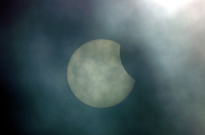 - 日蝕の始まる直前に一度太陽が見えたものの、その後は雲に遮られてしまいました。最大食分を過ぎてから小雨が降ったのですが、諦めずにチャンスを伺っていた結果です。
