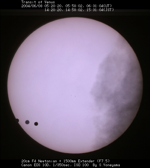 午前中撮影機材を準備していると雨が降ってきました。午後1時頃太陽が見えだしたので望遠鏡を向け潜入に備えました。潜入時間になっても太陽が見えませんでしたがビデオ撮影を開始して待機していると突然14時18分ごろ一瞬潜入中の金星がビデオカメラの外付けモニターに現れ、その後14時50分にも数秒間撮影出来ました。撮影後5時過ぎには再び雨が降って来て本当に奇跡的に捉えた画像です。