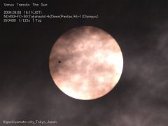 朝は雨。100%あきらめていた今回の天文現象。16時半ごろから少しずつ天候回復。相変わらず雲は多かったのですが、その隙間からなんとか撮影できました。水星の時と違って、金星はやはり大きいですね。感動しました。