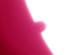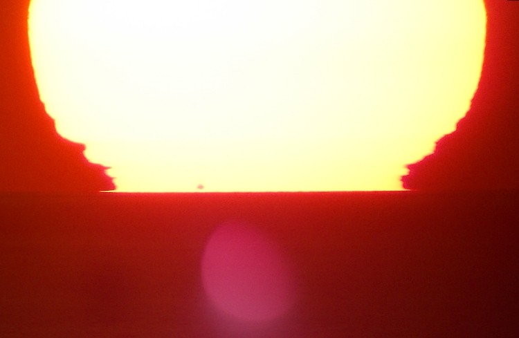 稚内市ノシャップ寒流水族館の壁際で撮影した金星の太陽面通過・最大接触です。青森県弘前市から2日間、列車を乗り継いで稚内に到着。機材の設営に時間を取られ、第一接触は撮影不能。日没直前、人生初のグリーンフラッシュが関東から来た日食仲間と共に見られました。