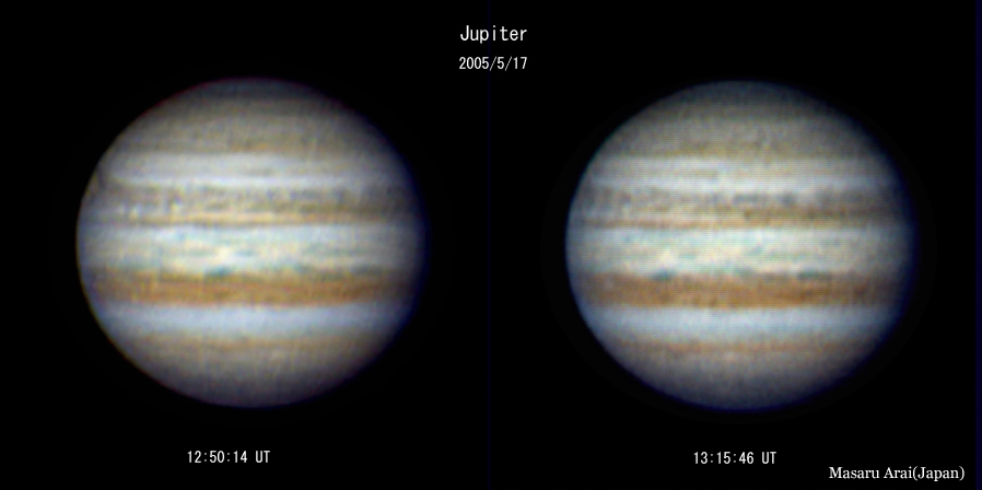 この日もシーイングは良かったのですが透明度が悪く、加えて画面の中を木星像が飛び回るほどの風でした。前日の画像とあわせてシーイングによる写り方(見え方)の違いを示す良い例になると思います。