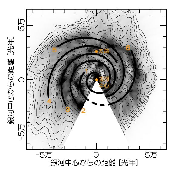 国立天文台野辺山宇宙電波観測所の中西裕之氏(研究員)と東京大学天文学教育研究センターの祖父江義明氏(教授)の研究チームは、中性水素原子(HI)と一酸化炭素分子(CO)の電波スペクトルデータを解析することで、天の川銀河の姿を初めて3次元的に描きだすことに成功した。