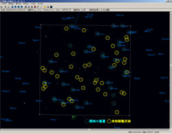 「ステラハンター・プロフェッショナル」の「スターチャート」画面。視野内の全ての小惑星が検出されて、さらに未知小惑星(黄色の丸)が見つかったことが確認できる。
