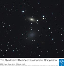 ヨーロッパ南天天文台(ESO)のIvo Saviane氏とオーストラリアのストロムロ天文台のHelmut Jerjen氏は、NGC 5011Cの一風変わった特徴に疑問をもった。それはまず、1億光年先という距離を基準にした場合の大きさだ。矮小銀河のように暗いのに、隣のレンズ状銀河NGC 5011Bよりも大きいことになる。実際、これほど明るさと大きさがバランスを欠いている天体は知られていないのだ。