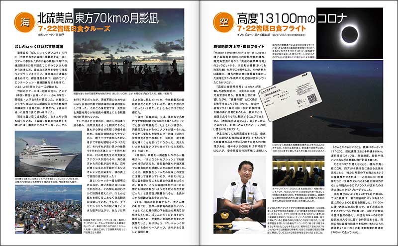 国内の科学館や公園での観望イベント、豪華客船のクルーが求める「完全な晴天」、そして高度13,100mでのボーイングB777の機長の決断。「陸」「海」「空」の3つの視点から、各方面のドラマチックな観測風景をレポートします。