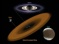赤外線天文衛星スピッツァーによる観測で、土星のまわりに直径が約3600万km(土星の300倍)、厚みが120万km(土星20個分)もある巨大な環が発見された。