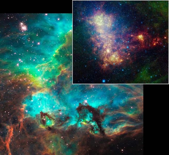 タランチュラ星雲と小マゼラン雲(右上)。クリックで拡大(提供:(タランチュラ星雲)NASA/ESA, and M. Livio (STScI); (小マゼラン雲)NASA/JPL-Caltech/STScI)