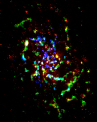 M33にある水素ガスなどの分布。赤が銀河に存在する若い星、青が星の材料になるガス、緑が塵を表す