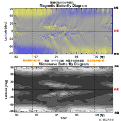 画像2枚目は、太陽磁場(上図)と電波(下図)の強度分布の変化を表したものだ。磁場観測では、よく黒点の数で表されるような低緯度での活発度を、電波観測では、磁場では観測が難しい極域の活発度を、それぞれ見ることができる。