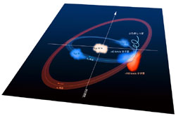 - 銀河中心核の周りの主要な2種類の楕円軌道に沿って運動する2つの巨大分子雲に、銀河円盤に対して垂直な磁力線の束が挟まれる。