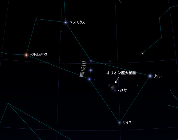 オリオン座大星雲の位置。オリオン座の三ツ星の下に、肉眼でも見つけることができる。ステラナビゲータで作成。クリックで拡大