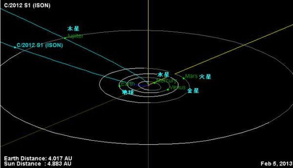 アイソン彗星の軌道。今は木星の軌道のところまで来ている。アイソン彗星は太陽表面から約180万kmまで近づき、肉眼でも見えると期待されている。クリックで拡大