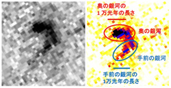画像は、みずがめ座の方向116億光年彼方の銀河と99億光年彼方の銀河が偶然重なって勾玉(まがたま)のような形に見える天体だ。初めは1つの銀河と考えられていたが、手前の銀河の存在が明らかになったことから、奥の銀河が手前の銀河の重力の影響(重力で光が曲げられる「重力レンズ効果」)で本来よりどのくらい明るく見えているかという研究が行われた。