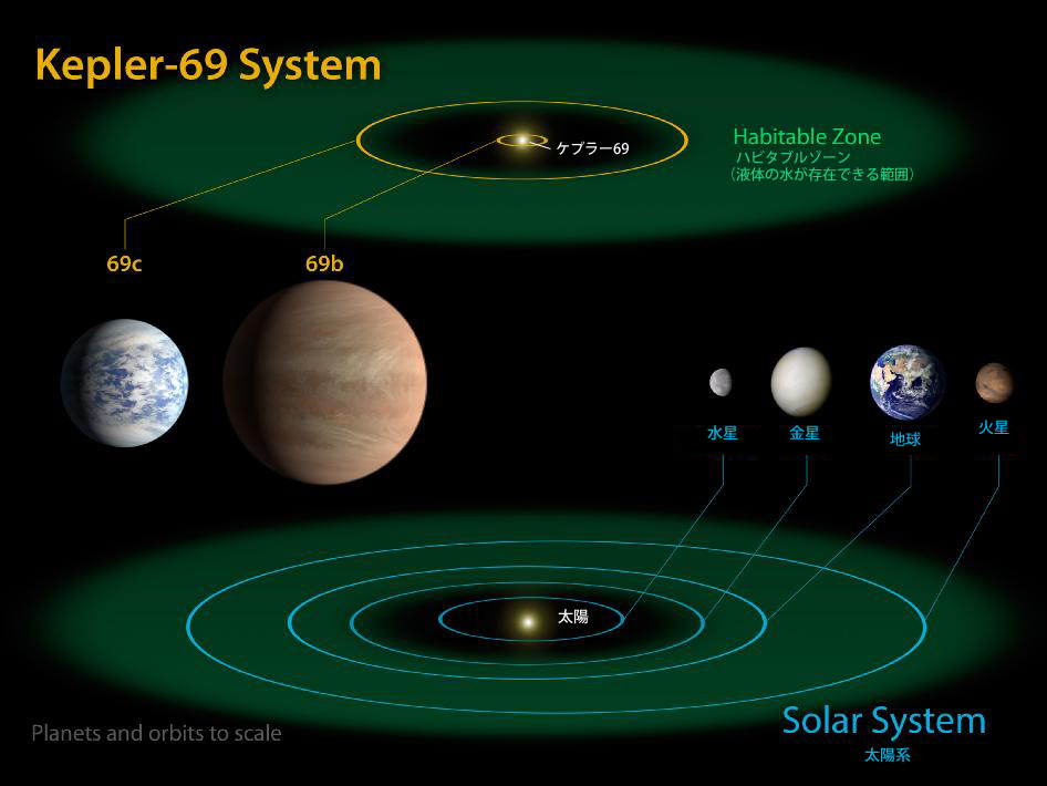 残るもうひとつのスーパーアースは、はくちょう座の方向2700光年彼方にあるケプラー69で見つかった。ケプラー69は太陽より少し小さく暗いが同じタイプの恒星で、2つの系外惑星が発見されている。そのうちハビタブルゾーンに位置するケプラー69cは直径が地球の1.7倍で、242日周期で公転している。この軌道は、太陽系でいえば金星のものに近い。