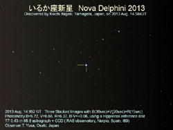 いるか座は夏の天の川のほとりに位置する比較的小さな星座ですが、1967年には3等級まで増光した新星(今日ではHR Delとの変光星名が付けられています)が出現したこともあります。そのいるか座の中に、6等級と双眼鏡でも簡単に見ることができる明るさの新星が発見されました。発見したのはこれまでにも多数の超新星や天の川銀河内の新星を発見されている、山形県の板垣公一(いたがきこういち)さんです。