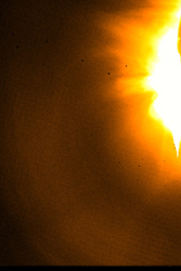 午前3時45分の画像右側に写っている明るい光は太陽の南東の縁の上空に広がる低層コロナだ。アイソン彗星はこの望遠鏡の視野の下(南)から左上(北東)に抜けていくはずだったが、通過が予測された3時3分から4時20分の画像には、彗星と思われる像は確認できなかったという。
