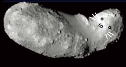 もうおなじみ、「はやぶさ」がとらえたイトカワの姿。「はやぶさ」チームの間でこの画像が出回り、ラッコの体の部位で位置を言い表すようになったという。クリックで拡大(提供:JAXA)