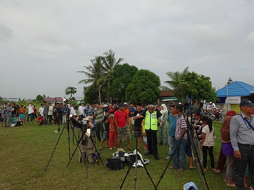 パレンバン郊外の日食観測場所を行った射撃場では、雲が多く厳しい条件の中、辛くも雲間からコロナを見ることができました。市内のホテル屋上で観測したグループは、残念ながら雲の中での皆既となりました。