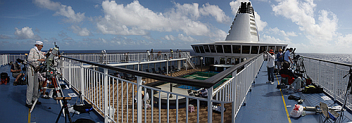 「ぱしふぃっくびいなす」での日食観測の準備風景。観測者のために12階のサンデッキのスペースが用意された