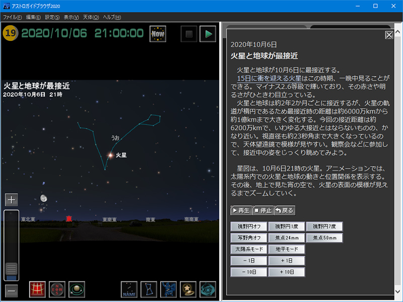 アストロガイドブラウザ2020は、恒星名や星座線などの表示、表示形式や視野範囲の切り替え、観測日時や場所の変更など、通常の星空シミュレーションソフトとしても便利に使えます。