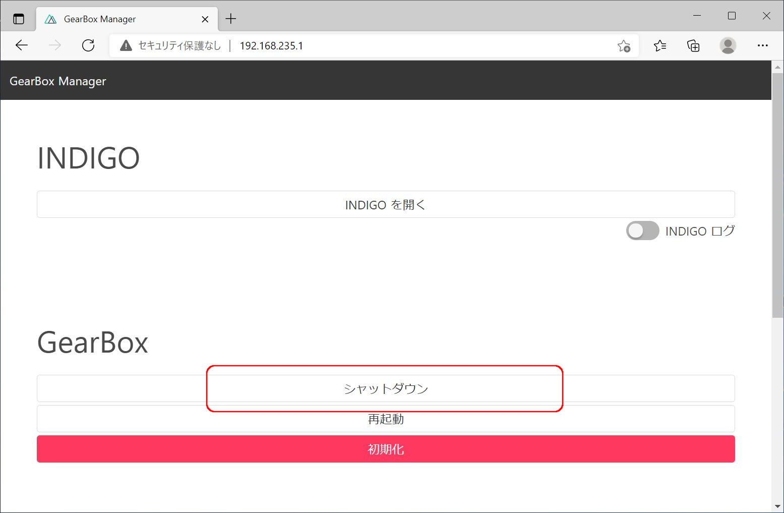GearBoxにWi-Fi接続後、Webブラウザで http://192.168.235.1/ にアクセスし、「シャットダウン」ボタンを押してGearBoxをシャットダウンします。