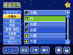 星座早見「星座早見」で月をみよう。[太陽系]から[月]をえらぶ。(下画面)