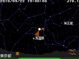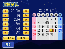 星座早見 下画面で日付や時刻を変えてみよう。月が実際に満月になる23日18時17分に合わせてみる。(下画面)