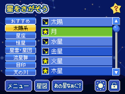 星をさがそう月が空のどこに出てるの?というときは「星をさがそう」で月をえらぶ。月は[太陽系]の中にある。(下画面)