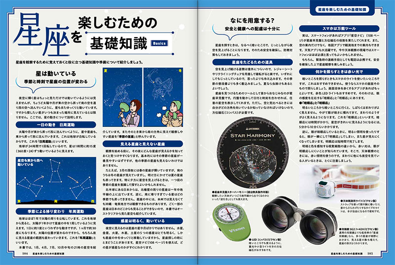ガイドブック 88星座を全て解説 全天には88個の星座があります。それら全てを、春夏秋冬、沖縄、南半球のいずれかの星空で紹介しています。 春の星座・夏の星座・秋の星座・冬の星座 東京から見える星空を基準として、それぞれの季節を代表する星座から、大きな星座の間に隠れた小さな星座まで、詳細な星図付きで紹介しています。 各星座ごとに、見つけ方・目印、星座の起源、星座の物語やギリシア神話のあらすじなどをわかりやすく紹介しています。88星座全てにデジタルアーティストKAGAYAの星座絵が用意され、イメージが膨らみます。 南天の星座 「沖縄で見える星座」では、日本の本州あたりでは見られないものの、沖縄あたりまで南下すると見つけることができる、南天のめずらしい星座の数々をご紹介しています。巨大な帆船の形をした旧アルゴ座や、南十字星も、沖縄まで行けば見つけることができます。 沖縄でも見えない星座は「日本から見えない南半球の星座」として紹介。大航海時代に作られた風変わりな星座が登場します。 星座を楽しむために 「星座を楽しむための基礎知識」では、星座の動きから見るための道具まで、星座を見つけるために知っておきたい重要なポイントを解説しています。星座観察をする際に、どんな準備をしてどこに行って見ればよいかがすぐにわかります。「星空ナビ」で星座をさらに楽しむためのコツもご紹介。 そのほか、星座の歴史や、星座や星についてのちょっとした雑学コーナーなども収録されています。いずれも内容を全面的に見直し、最新の知識にあわせた正確な記述になるよう改訂しました。