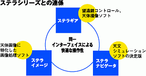 ステラナビゲータ(天文シミュレーション)、ステライメージ(画像処理)、ステラギア(天体撮像)の3ソフトは互いに連携しています ステラナビゲータの高速・高精度星図表示エンジン、ステライメージの画像処理エンジンを受け継ぎ、撮影に最適化した機能で使いやすさを追求しています。