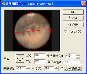 - ダイアログ(fig2)が開いたら、赤いガイド線が惑星像とぴったり重なるように調整します。