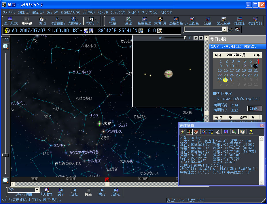 また、プラネタリウム的な地平座標モードのみならず、星図的な赤道座標モードや天球を円盤に投影する星座早見モードなどを切り替えて使うことができた。もちろん、天体データも当時としては充実度が高く、恒星8,952個(6.5等まで)、星雲・星団571個、変光星11個をはじめ、太陽系惑星や流星群など多彩な天体をサポートしていた。