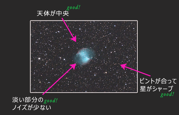 対象天体がきちんと真ん中にあるか。いわゆる「日の丸構図」が一般的な構図です。