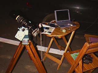 デジカメで捉えた月食の画像は、ノートパソコンで即座に処理して、 携帯電話で新宿・中継本部に送ります。